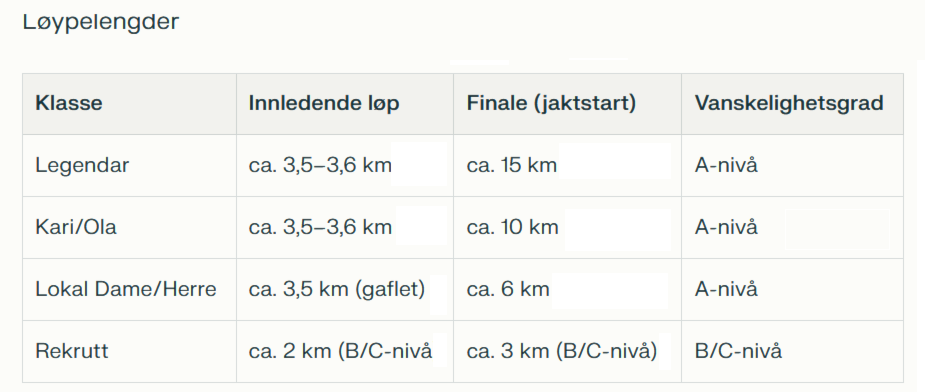 • Rekrutt: For yngre, uerfarne eller nybegynnere, ofte løpt som par-løp på kortere, lettere løyper – typisk 12-14 år, men åpen for alle.
